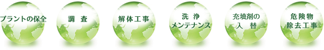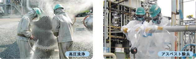 石油化学プラントのメンテナンス作業全般、特に据付・分解・整備・点検等において60年積み重ねてきた実績に培われたノウハウをもち、独自の技術と設備で全て行うことができます。これらの工事を全て独自に行える点は、明菱の特長でもあり、施行した工事内容について高い評価を頂き、企業としての信頼を築いています。明菱では、国産機械のなかった時代からプラント機器の高圧洗浄に携わり、高圧洗浄車を利用しての機械内部のクリーニングを行ってきました。また、この他、機械的洗浄、物理的洗浄、化学的洗浄等、新分野の開拓にも取り組み成果を挙げています。